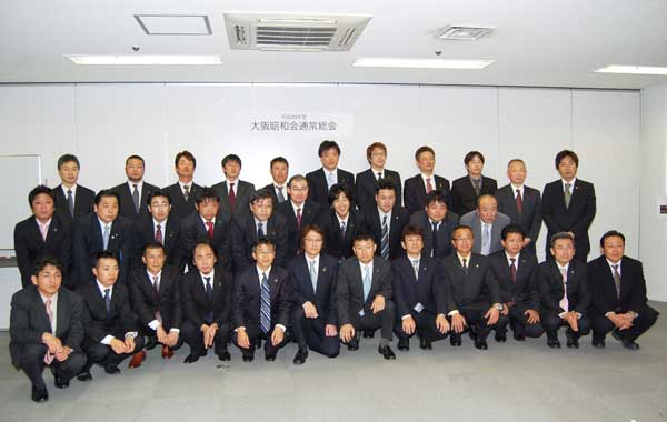 | 平成20年度通常総会は4月17日、エル大阪で開かれました。 度事業計画では▽年2回のボランティアを見直し、府の施設も対象にする(事業委員会)▽ホームページなどを媒体にして各地昭和会との交流を深める(広報委員会)▽メールで企画を募集して事業テーマを設定する(企画委員会)▽会則を変更し、会長の諮問機関として活動する(長期計画室)―などを推進していきます。 任期満了による役員改選では、外村耕作会長が就任しました。 新役員は次の通りです。 【会長】外村耕作(ソトムラ)【長期計画室長】 澤田浩一(協榮塗装工業)【副会長】企画担当・林光一郎(林塗装)▽事業担当・小城孝次(コジョウテックス)▽広報担当・石塚純一郎(石塚塗装)【企画委員長】田代公一(タシロ)【事業委員長】別所亨(大阪塗装)【広報委員長】湯川周作(三和塗工)【会計】濱脇健志(浜脇工業)【進行理事】高山恒夫(高山商店)【事務局】西岡和哉(日本ペイント販売) |