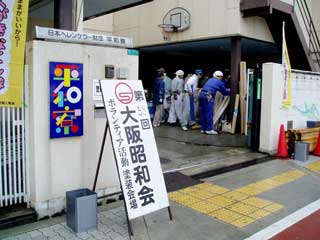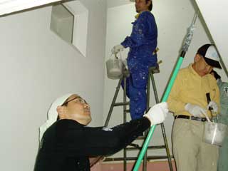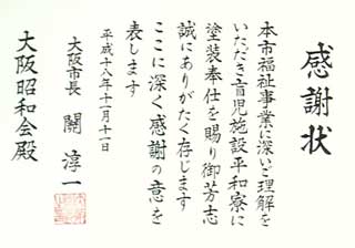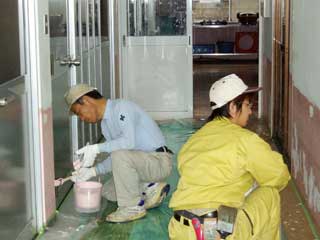 | 平成18年11月11日、大阪市阿倍野区の「平和寮」でボランティアを行いました。平和寮は、視覚障害を持つ児童のための施設で、大阪昭和会が塗装ボランティアを行うのは昭和54年、60年に続いて3回目です。今回は約50人が参加し、室内の壁や天井などを全面的に塗り替えました。 |